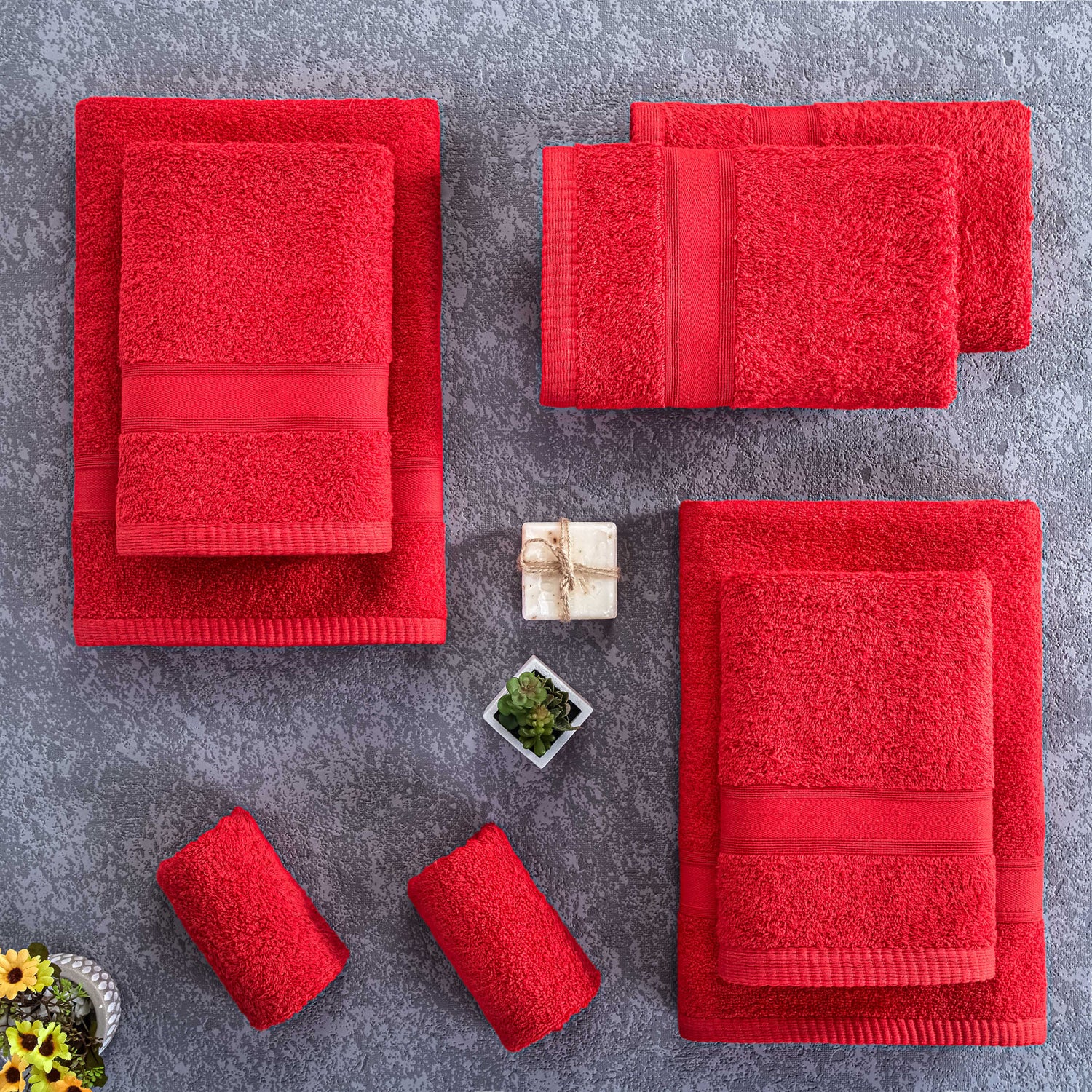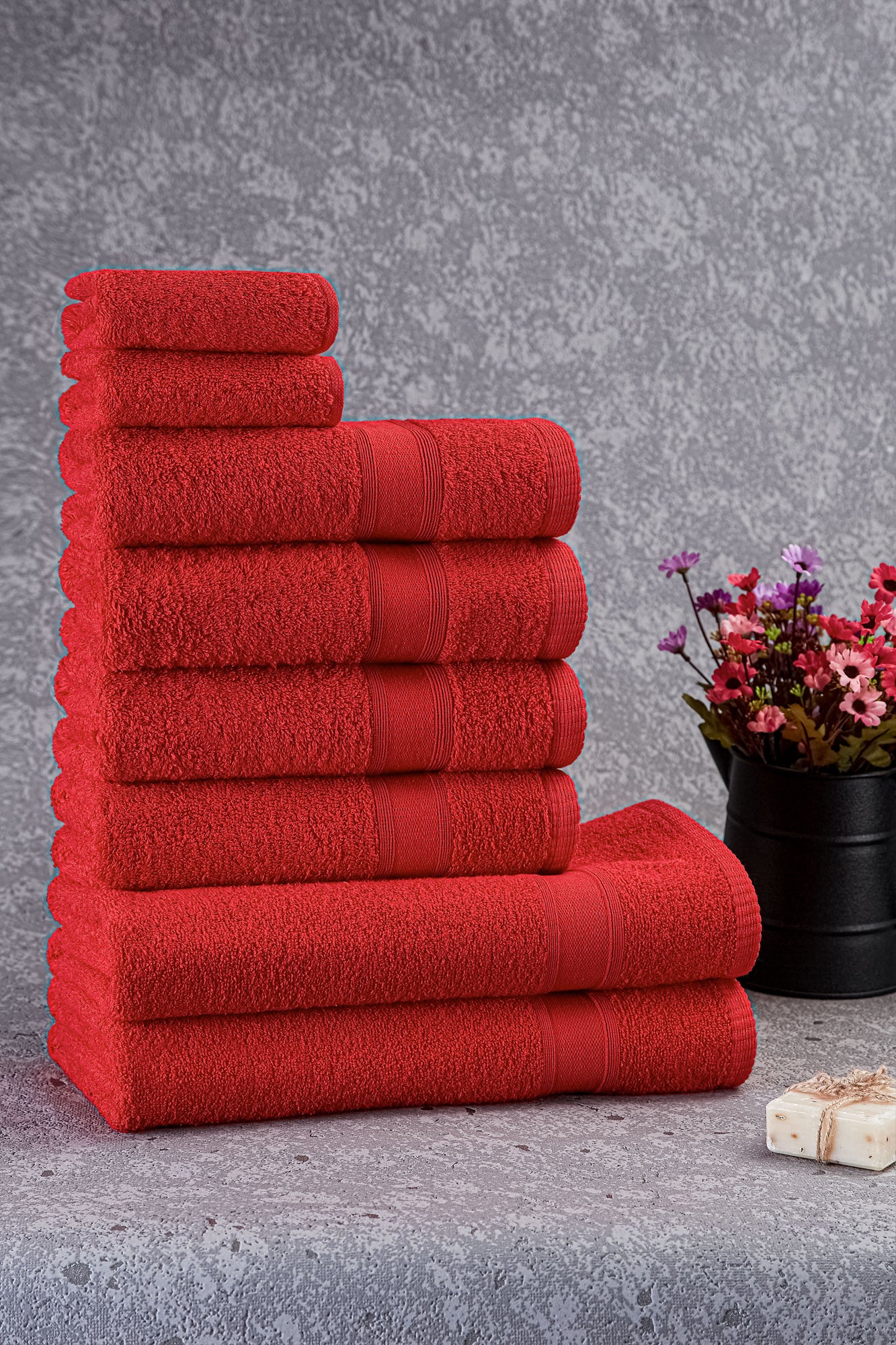 Luxuriöses 8-teiliges Handtuchset: Enthält 2 Badetücher, 4 Handtücher und 2 Gästetücher in einem schönen Rotton.